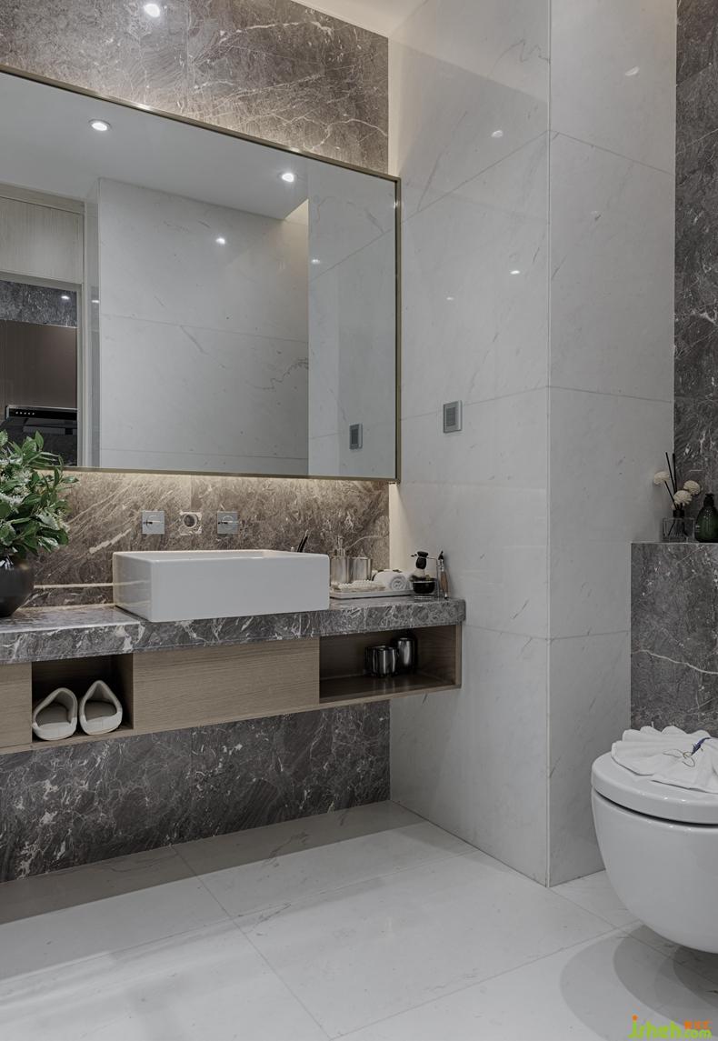 衛(wèi)生間干濕分離的洗漱空間設計,功能齊備。淋浴間玻璃門采用部分磨砂處理,提升設計感的同時也增加了私密性。深圳裝修公司