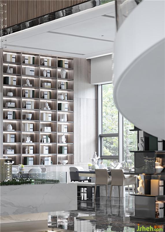 洽談區(qū)以木色貫穿,體塊式的書架墻顯現(xiàn)書卷氣息,在素雅的底色氤氳下,東方的靜默文雅與當(dāng)代簡約共融相生。