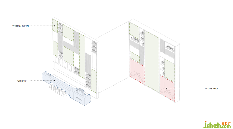 以綠色明快的墻面分割設(shè)計(jì)媒介,垂直的綠色生態(tài)隔斷憑欄處俯視空間的構(gòu)成穿插。延伸了空間層次通透感,讓空間的存在穿透和時間的界線。