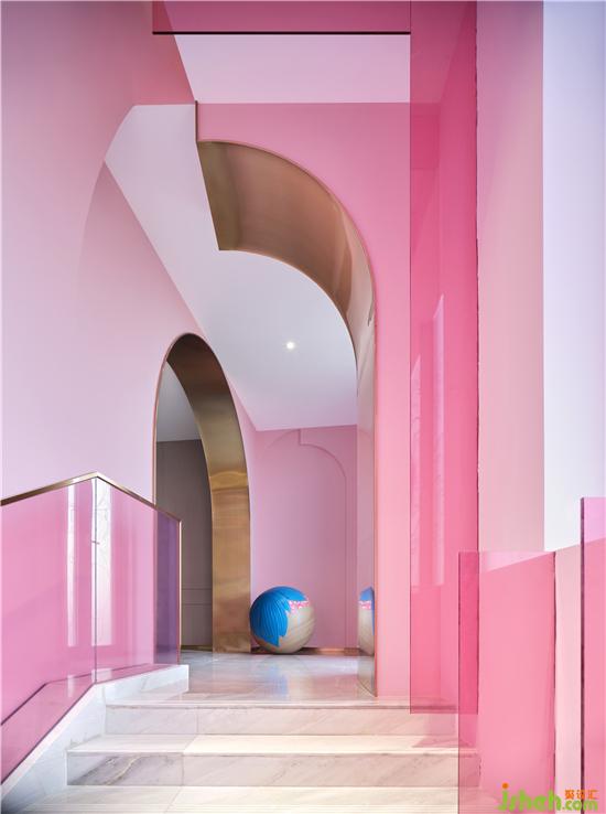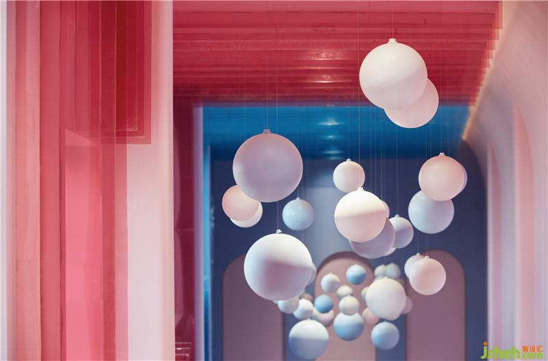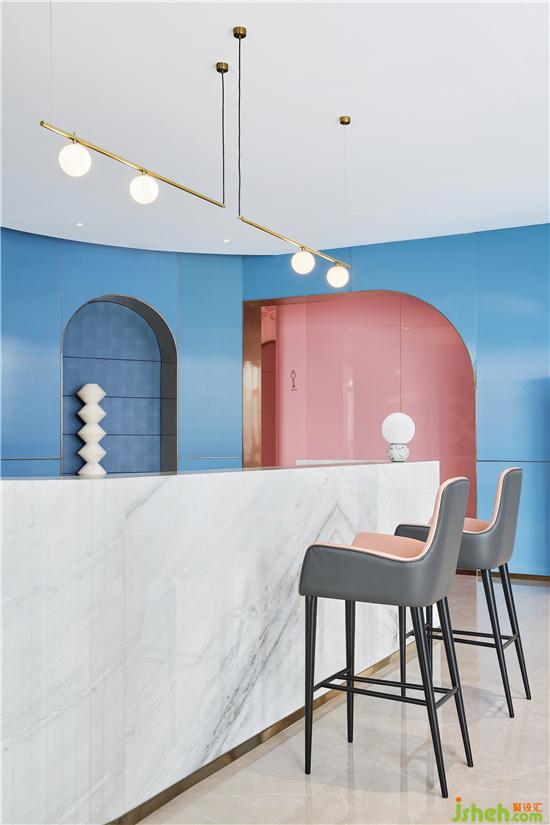 人生好似‘名利場’,設(shè)計師就如這場戲中的造夢師。情感是空間設(shè)計中最重要的元素,洽談區(qū)域藍(lán)色與粉色的塊面穿插,如同打翻了馬卡龍的顏料盤,蘊(yùn)含著沉浸心靈的精神力量。