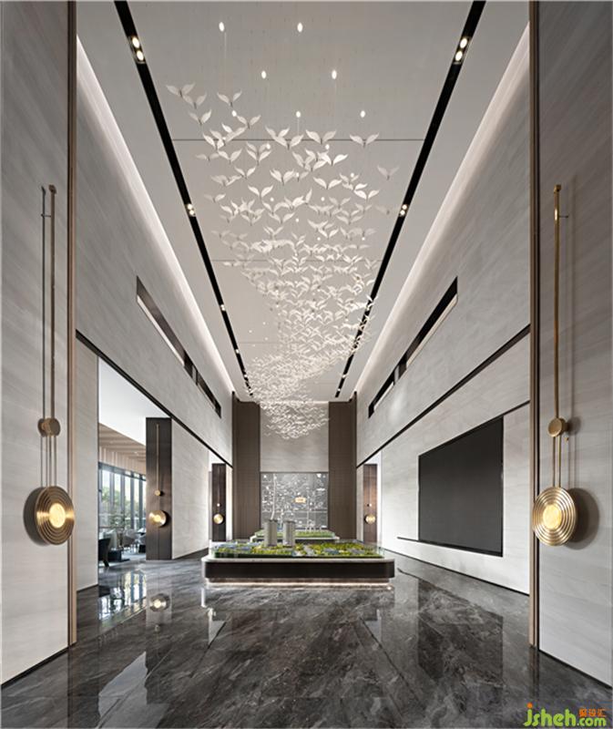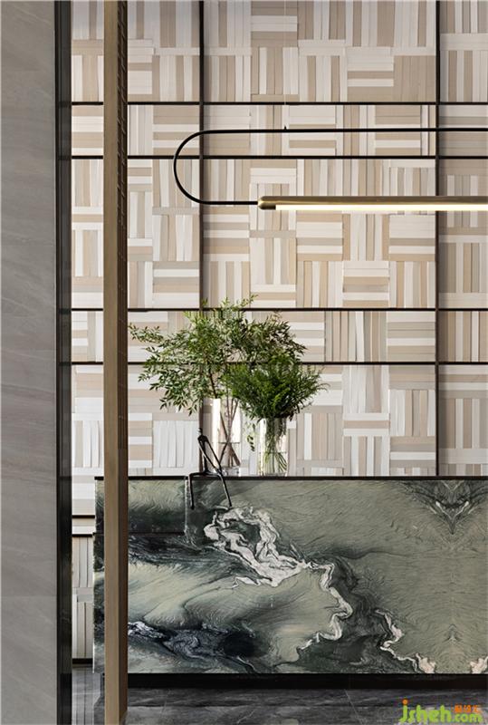 空間兩側(cè)以幾何體塊的形式劃分空間的通透性,低調(diào)清雋的灰色大理石融注當(dāng)代藝術(shù)的氣質(zhì),木紋格柵的漸變飾面,在視覺(jué)的演變中,展呈萬(wàn)象變幻的美學(xué)截面。