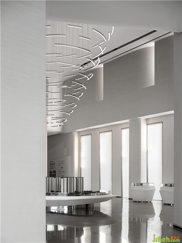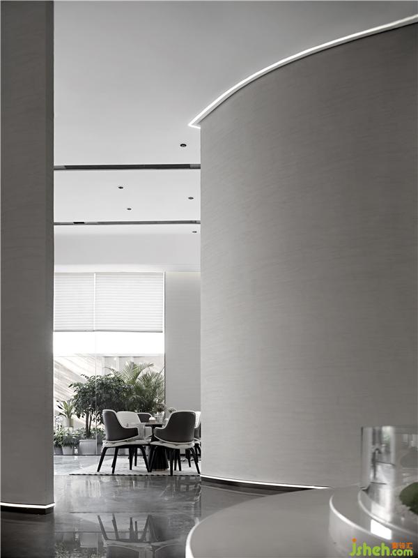 接待前廳,幾段曲線,寥寥幾筆繪盡漢水迸流的寫意之美,意象與自然并肩偕行。深厚的人文與線條的靈動(dòng)如浪濤般綿延,素雅無(wú)邊卻又風(fēng)雅自成。