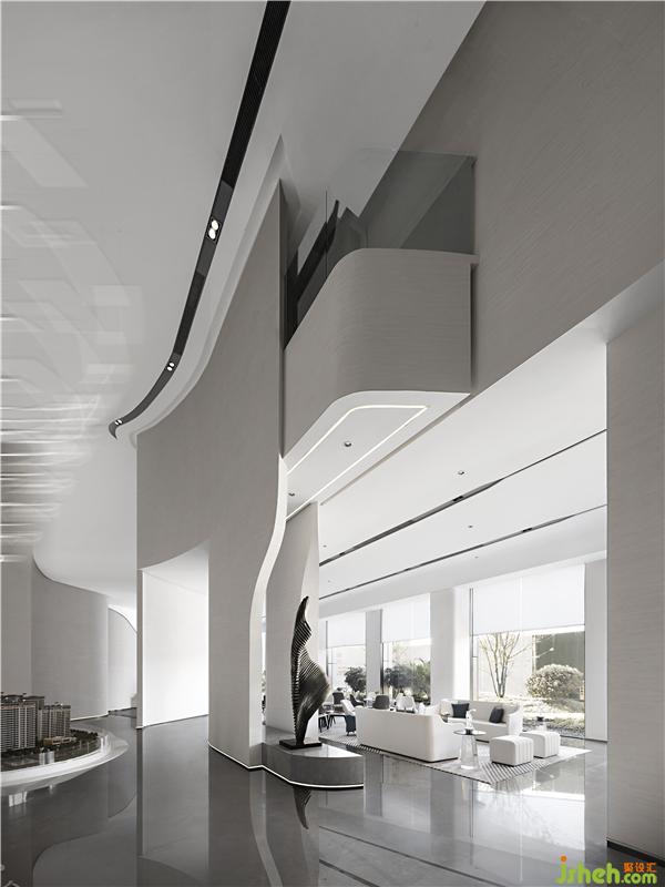 接待前廳,幾段曲線,寥寥幾筆繪盡漢水迸流的寫意之美,意象與自然并肩偕行。深厚的人文與線條的靈動如浪濤般綿延,素雅無邊卻又風雅自成。