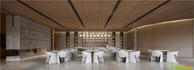 金屬材質(zhì)與富有紋路質(zhì)地的巖石墻面,二者的對(duì)撞融合,在爐火光影的繪寫(xiě)中,形成水火的交融,鋪展開(kāi)不同層次的美學(xué)交匯,嶄新的空間體驗(yàn)中亦賦有文化的內(nèi)涵,圍造溫暖、純凈的洽談場(chǎng)所。