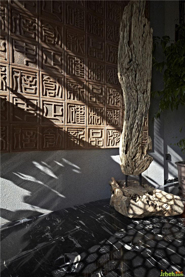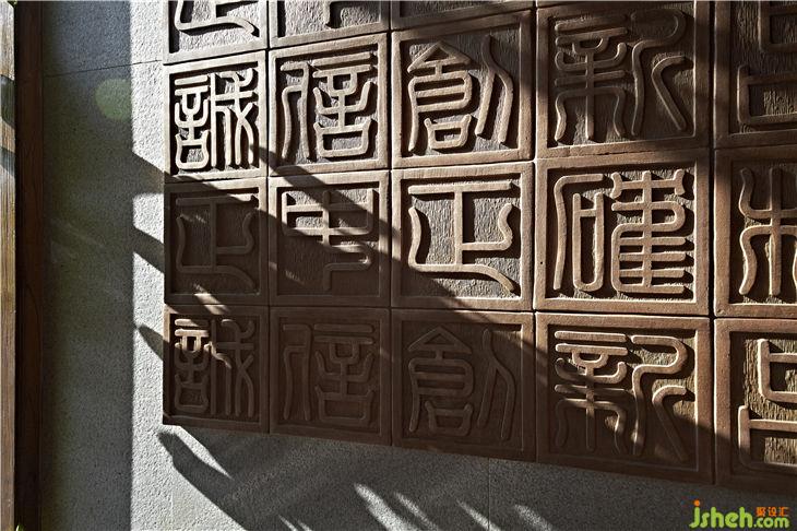 本案設(shè)計(jì)充分承傳了中國傳統(tǒng)文化之精髓,采用純天然的榆木為主材配合對比強(qiáng)烈的銀白龍大理石,色調(diào)以淺褐色古老榆木中注入凹凸紋現(xiàn)代技術(shù)處理,突顯設(shè)計(jì)上的創(chuàng)意;設(shè)計(jì)亮點(diǎn)是通過漢字雕刻的陶磚壁飾和企業(yè)標(biāo)志自制燈飾來傳達(dá)企業(yè)的品牌文化,在傳遞企業(yè)理念和精神時(shí)巧妙把傳統(tǒng)元素與品牌文化揉和在一起,營造一種既充滿傳統(tǒng)文化又體現(xiàn)現(xiàn)代理念的視覺空間。