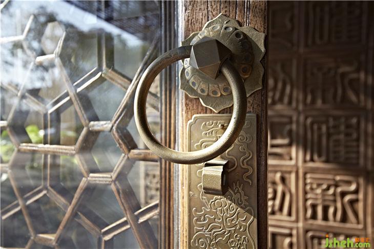 門面以酸洗成凹凸亞光深灰色的天然中國黑花崗巖石與厚實(shí)自然的榆木為材料,整體穩(wěn)重而古樸;雙扇頂天立地傳統(tǒng)紋樣的木格門扇配上青銅門環(huán)極具沖擊力,讓人感受到中國傳統(tǒng)裝飾的力量,引發(fā)人們懷舊情愫,歷史瑰寶與儒雅文化蘊(yùn)含其中,東方神韻盡顯;大門兩側(cè)的全玻璃門在古式立柱的烘襯下更顯現(xiàn)代與古老的融合,是中華文化歷史內(nèi)涵與現(xiàn)代時(shí)尚生活相互交融。