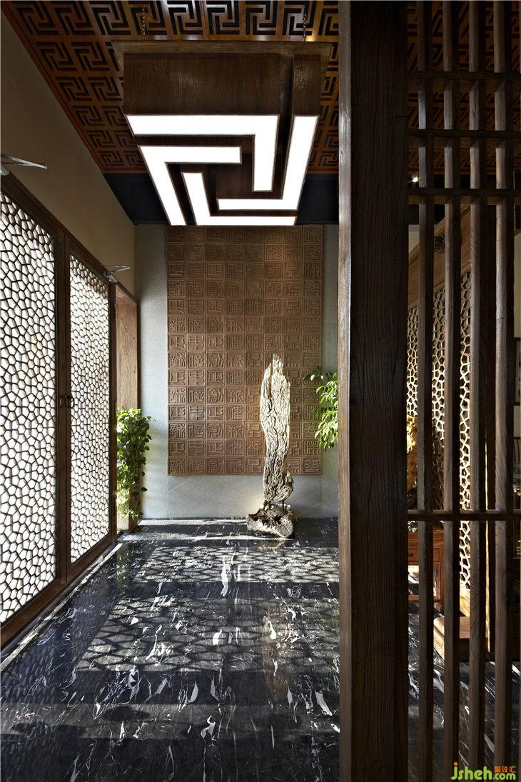 進門榆木花格屏風前擺放著一塊純天然的竹葉紋肌理的潮州臘石,敦厚而精細;裝飾在門廳天花上正格設計標志的大燈與左側(cè)整面墻的一塊塊雕刻著篆書漢字的陶磚是正格設計企業(yè)文化的釋義,古老陶磚元素如神來之筆,釋放出一種文脈、一種理念,傳達一種正格文化精神。