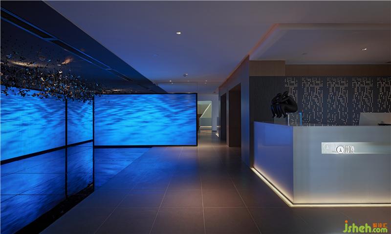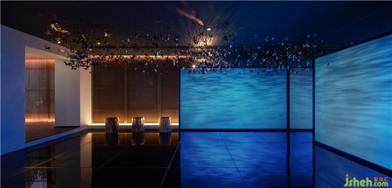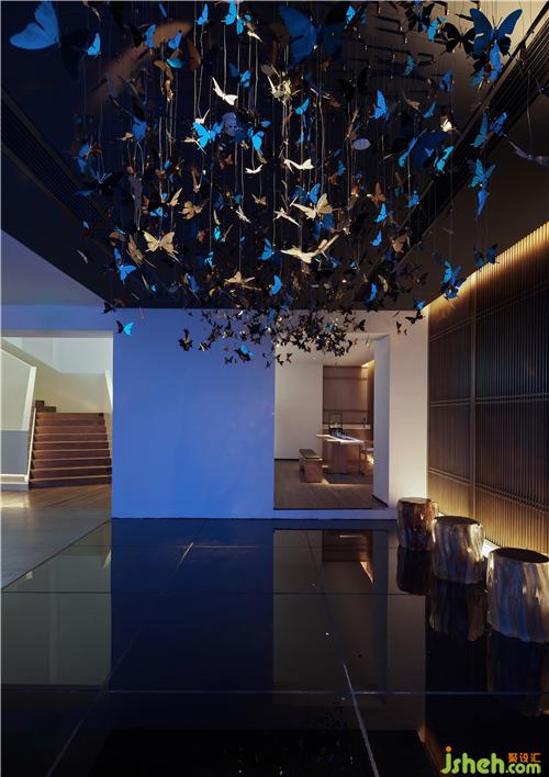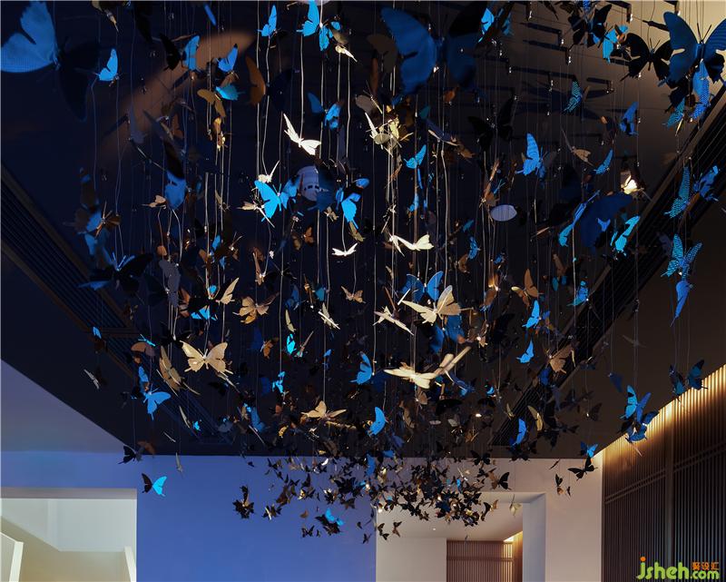二樓等待區(qū),設(shè)計(jì)師持續(xù)遵循“九重景、九重境、九重品”的理念,中魂西技、去繁就簡(jiǎn),打造以山水為脈絡(luò)、以自然為心,以樹石為核,以人為尊的空間精髓。漫天飛舞的蝴蝶,在藍(lán)色的光景屏幕的襯托下有著輕松、靜謐的調(diào)性,更在冷光與暖光的沖撞、融合過(guò)程中,烘托出令人沉醉的絕美空間。整個(gè)空間以自然為設(shè)計(jì)重點(diǎn),透過(guò)大量木作、燈飾、思考人生的雕塑等物件,刻畫出細(xì)膩的生態(tài)質(zhì)感,讓人沉心靜氣、寧?kù)o致遠(yuǎn)。