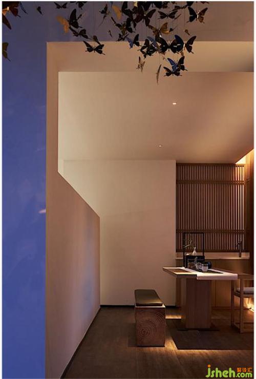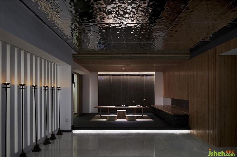 “洗盡古今人不倦,坐擁九曲品香茶”,與服務(wù)臺(tái)相連的休息茶座映入眼簾?!耙痪頃?、一盞茶、一爐香,食進(jìn)千古茶,品悠九境韻?!痹谶@質(zhì)樸無(wú)華的空間一隅,大膽的采取了中式借景的手法,從人審美和功能需求出發(fā),突顯出現(xiàn)代人對(duì)生活精致追求和愜意生活的真切感受。會(huì)所設(shè)計(jì)