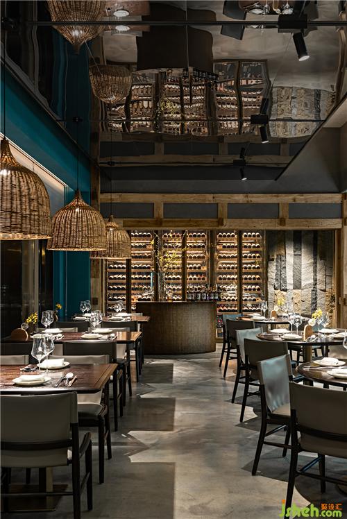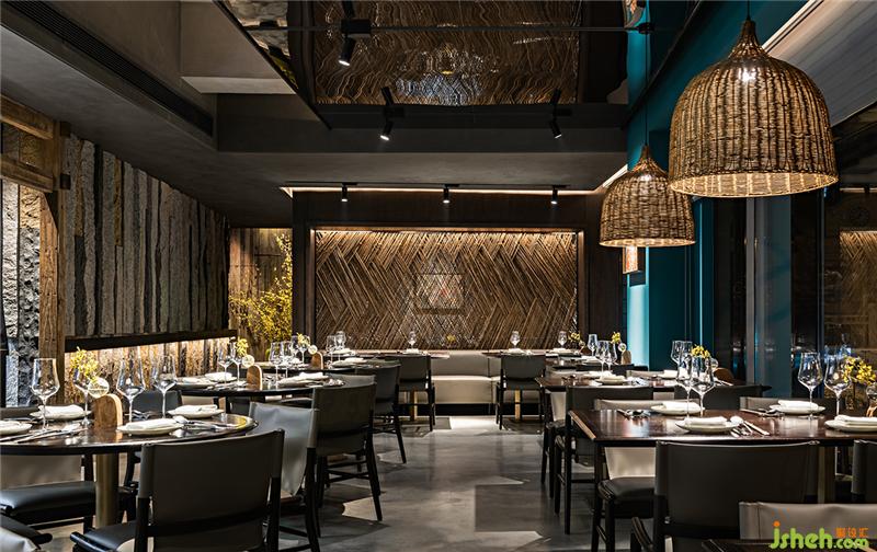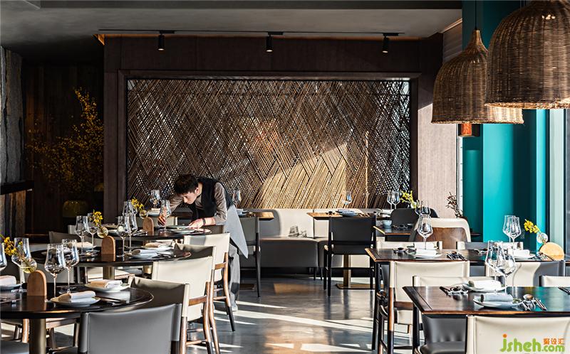 開放就餐區(qū)里,竹子、藤條經(jīng)過有節(jié)奏感的編織獲得了新身份,作為屏風、屋面裝置、吧臺等等,設(shè)計師賦予它們簡潔當代的整體感,又利用質(zhì)樸材料本身創(chuàng)造細節(jié)中豐富的精致。