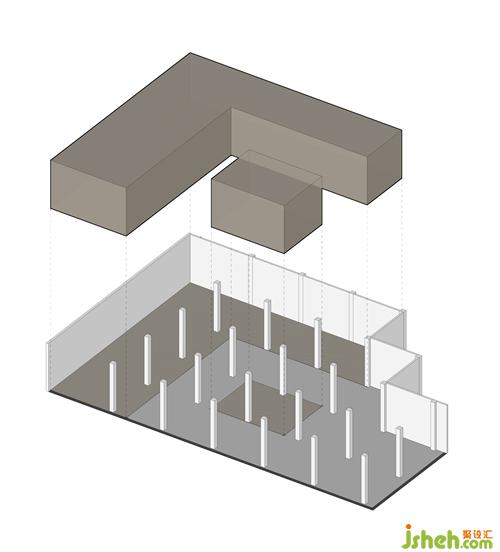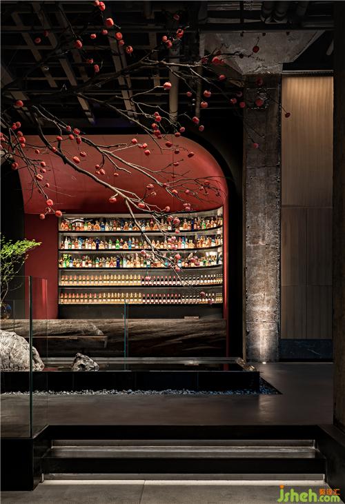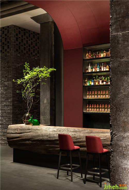 紅色吧臺區(qū)構(gòu)建出另外一個場景——5.2米高的紅色立面向上延伸、彎曲成弧形頂面與建筑結(jié)構(gòu)相接形成灰色水泥盒子中一個嵌套的模塊,古老京城似乎正從這一隅慢慢醒來,被注入鮮活涌動的生命力。