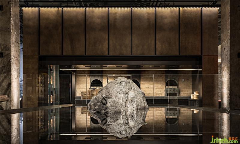 進(jìn)入晚餐時段,大面積渲染的藍(lán)色燈光從天花及部分墻面“溢出”,如同數(shù)字化的夜晚天光。當(dāng)代設(shè)計(jì)手法、傳統(tǒng)地域文化與舊建筑符號交匯成動態(tài)的時間線,和進(jìn)入空間的每個人發(fā)生交互。