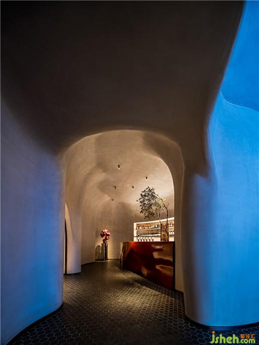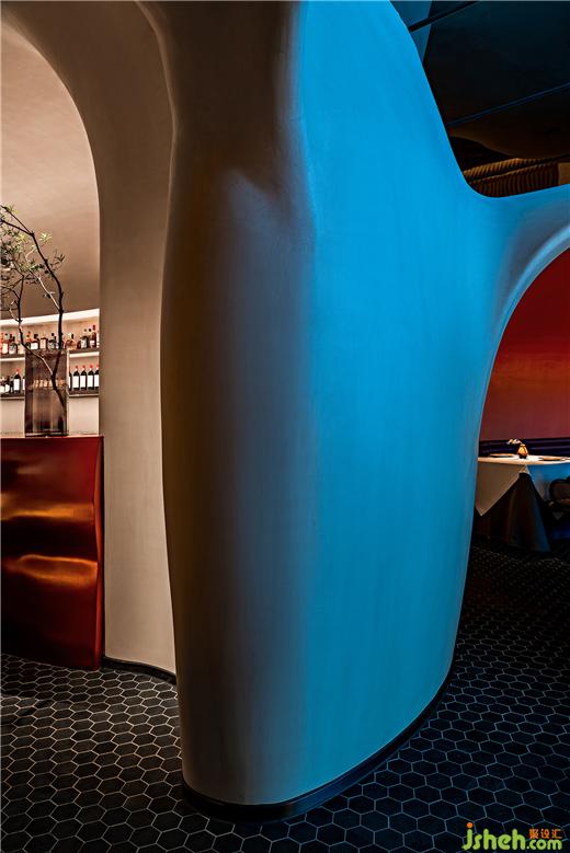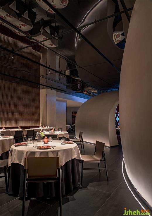 在相對緊湊的內(nèi)部,腔體結(jié)構(gòu)一方面將空間二次分隔,餐廳設(shè)計(jì)創(chuàng)造了內(nèi)部的內(nèi)部,另一方面作為開放區(qū)的雕塑景觀與視覺焦點(diǎn),高效破解了空間和視覺的雙重議題。