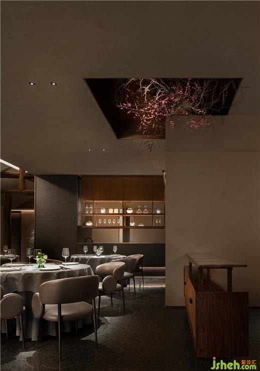 劈鑿厚重的山石立面和紋路深刻的老木板粗獷地勾勒了臺(tái)州開闊的山海精神;禾苑餐廳設(shè)計(jì)混合著蝕刻黃銅、斑駁灰磚、大理石、舊木板的空間將古老的江南民居疊映在上海之上;石墩木柱曾撐起沿革千百年的古老建筑,在新城市發(fā)展的風(fēng)云際會(huì)中漸漸隱入歷史的煙塵,在簡潔素然的現(xiàn)代底色前驚鴻一現(xiàn);城市華燈初上,東方和西方在同一底色中彼此相容。
