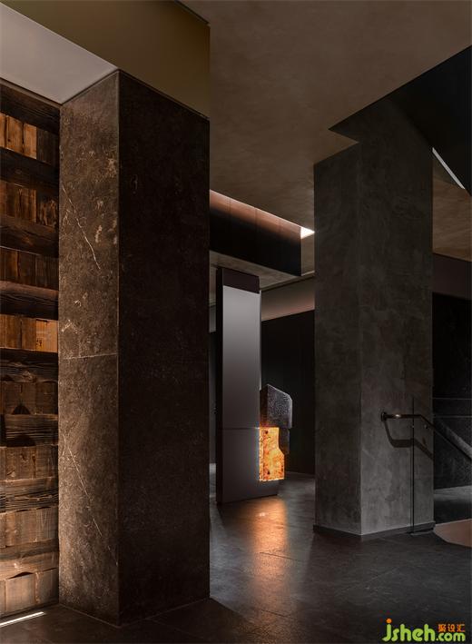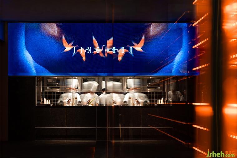 一層明檔是進出餐廳兩次必經(jīng)的通道,它是一個煙火氣和當代感十足的序幕以及謝幕,食客進出都能觀察到廚房紅火忙碌的備餐過程,巨幅LED屏和酒窖共同營造出迷人的燈光效果和融合體驗,創(chuàng)造出一種充滿參與感和本真的用餐體驗。