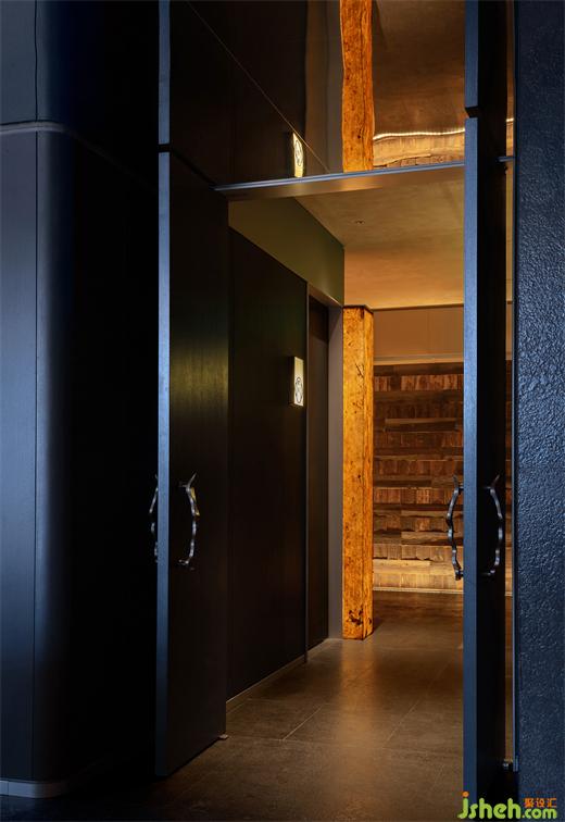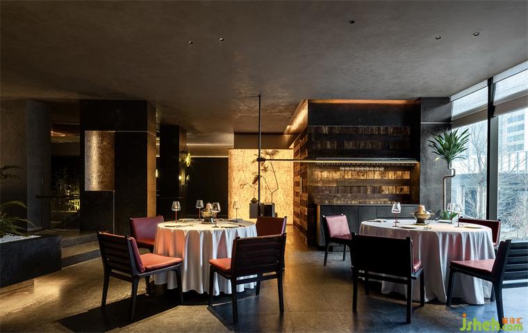 古人講究銅鍋炭火,銅是紫銅,炭是梨木碳,涮出的肉都帶著梨木香氣,更有豪華版銅鍋外表采用景泰藍工藝??紤]到環(huán)境等因素,現(xiàn)代銅鍋已不再用碳,京π保留了景泰藍銅鍋,炭火的傳統(tǒng)則引申為空間內(nèi)大面積使用的炭化木,紋理富于變化、肌理自然粗糲的炭化木與銅板、金屬板穿插,調動出空間穩(wěn)而不重、古今共筑的質感。