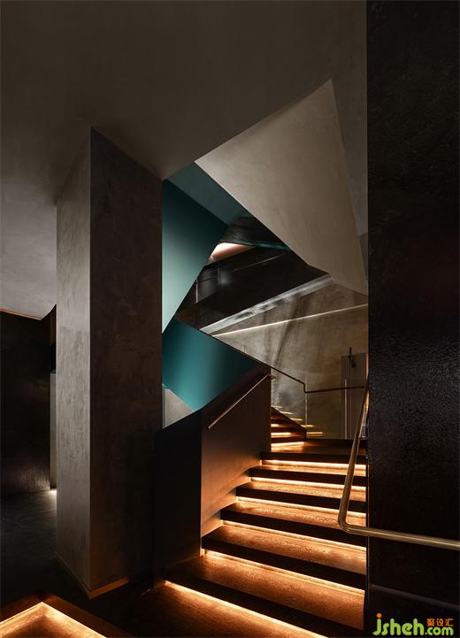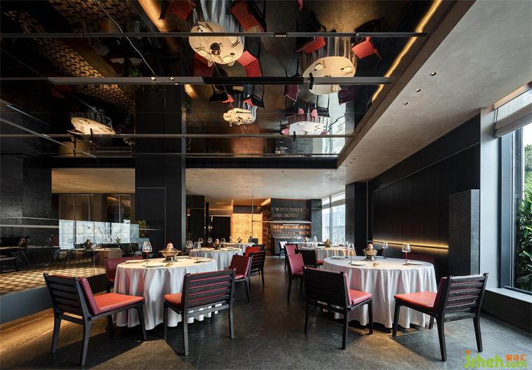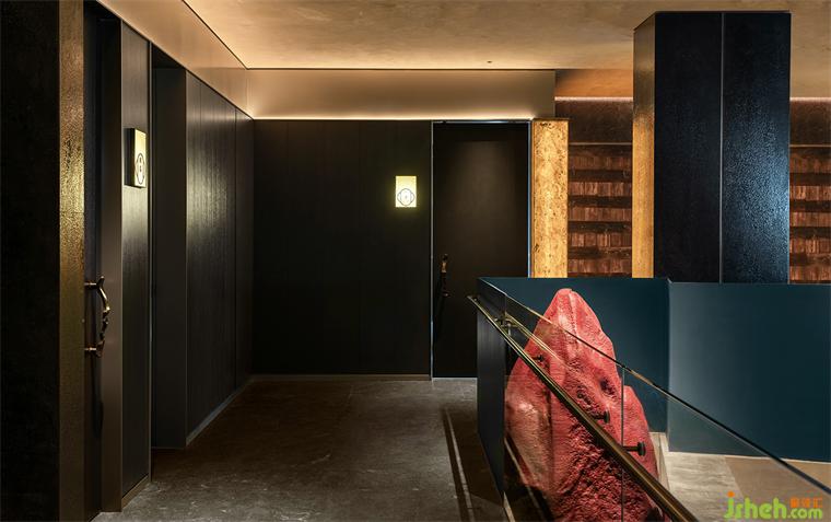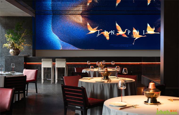 扶梯一側使用傳統(tǒng)天青色,如宋畫中一行流水以當代的力道貫穿垂直空間。山石、畫屏、透光石做角落點綴,傳統(tǒng)意向成為當代空間偶爾的駐足和回望,火鍋餐廳設計對比重力度的把控也是設計在詮釋當代空間時的重要考量。