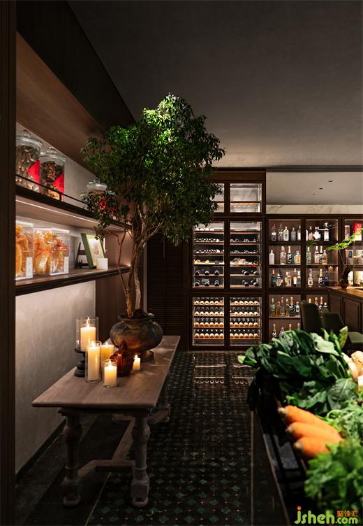 鮮活肉檔、食材展架、酒窖吧臺在入口儼然營造出生動考究的煙火場景。隨著轉(zhuǎn)過酒柜進入散座區(qū),空間收緊又忽而敞開,進入前的喧囂如泡沫在身后破碎了。散座區(qū)寬敞完整,充分的開放性并不傷害功能,寬大的多功能臺恰好使走廊和就餐區(qū)分隔,一動一靜、一古一今,交錯并行,使餐廳也有了博物游觀的樂趣。