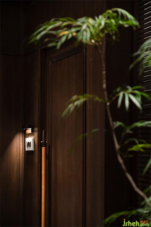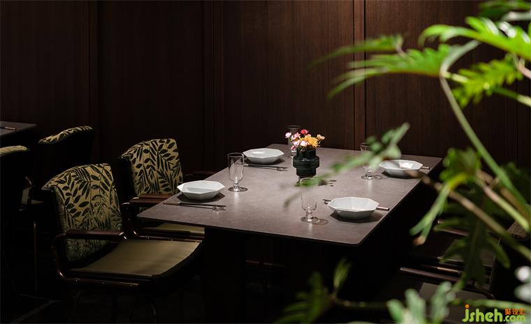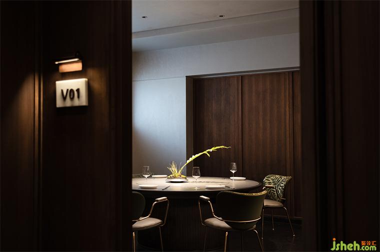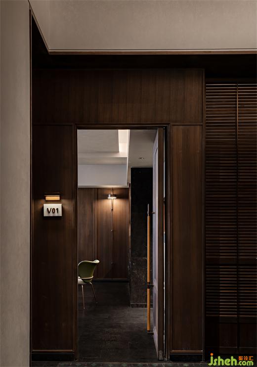 沿花磚廊道至包房區(qū),木飾面包覆的半圓結構柱陡然打破平直的空間,婉轉的流動性將客人吸引至更深處的空間?;疱佋O計空間曲率的一點變化像畫師腕力一轉,畫中鳥獸隨即靈態(tài)必現(xiàn)。角線片段式地編織進天花結構,低調不失輕巧地致意古典。人們總對起伏跌宕的敘事著迷,空間亦如是,在變化的韻律里,煙火趣味生生不息。