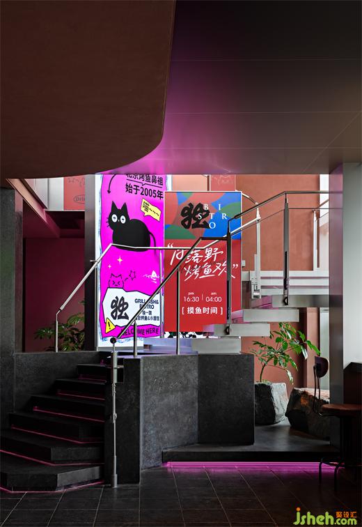 在燈箱和空間角落不時(shí)露頭的一只黑貓是設(shè)計(jì)師為餐廳設(shè)計(jì)的“夜貓”IP,每到日落,北京烤魚鼻祖接管年輕人的摸魚時(shí)間:溫柔澎湃、自在微醺。