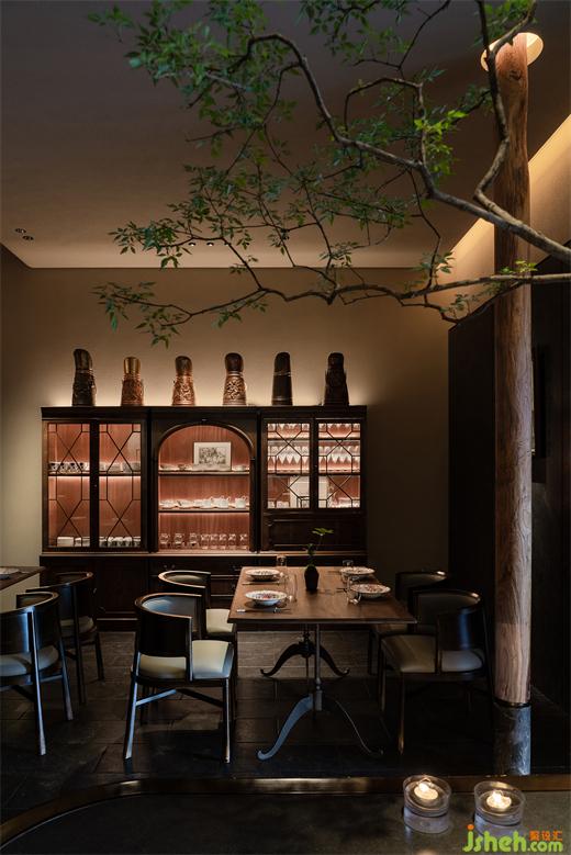犧牲掉室內(nèi)部分面積后,云南菜餐廳設(shè)計(jì)師成功創(chuàng)造出一個(gè)安靜的與戶外連接的內(nèi)庭院,散座區(qū)流暢地過(guò)度到自然光和戶外環(huán)境中,所有室內(nèi)陳舊的、低垂的、粗糲的都從這個(gè)出口涌入天光中,然后成為炫目的、高昂的、細(xì)膩的一部分,與城市再度相融。這個(gè)小小的園林意向的區(qū)域也作為餐廳的精神內(nèi)核,生息在人們對(duì)古意和自然的回望向往中。