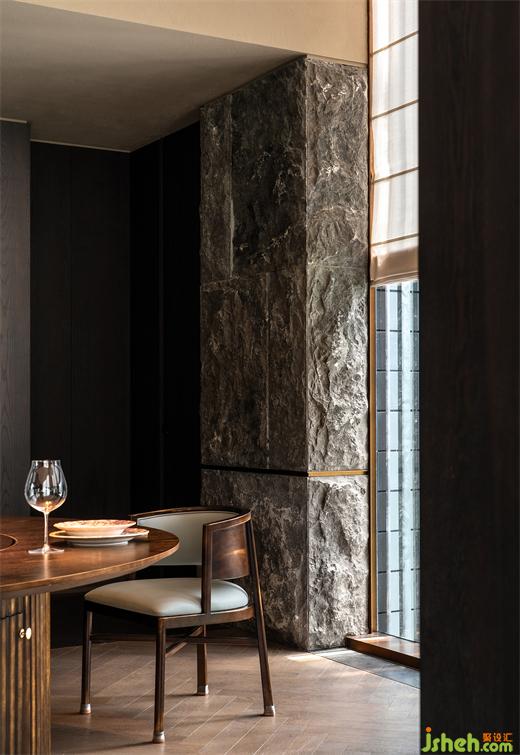粗獷的帶有沙礫質(zhì)感的涂層包覆散座區(qū)天花和立面,磚結(jié)構(gòu)柱和相對(duì)纖巧的木結(jié)構(gòu)組合成多功能臺(tái),同時(shí)作為散座區(qū)強(qiáng)有力的精神支撐,看似未經(jīng)修飾的材料和極端簡(jiǎn)素的結(jié)構(gòu)處理將食客“放逐”在原始、自由的味覺(jué)邊地。