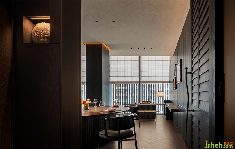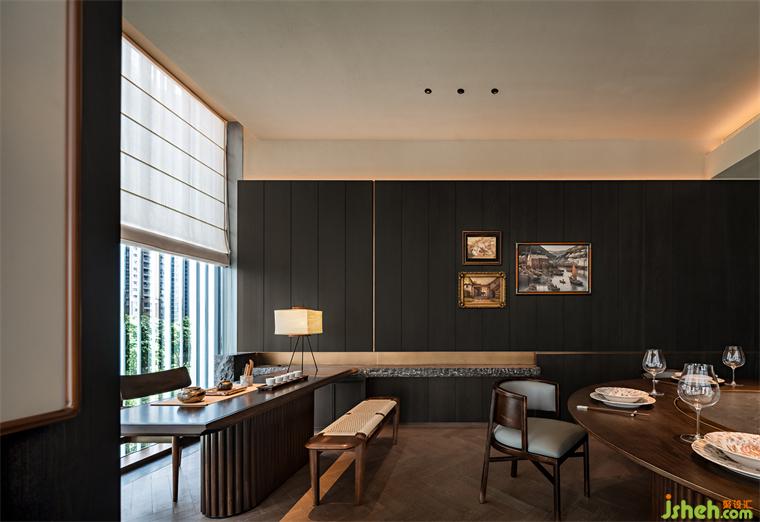 沿走廊至包房,石板磚附著一層油潤的薄光,漫漫層疊的黃土是視線盡頭的地理造像。枝形黃銅把手后,包房像一段上揚的樂章作為空間的終段。潔凈的材料幾乎不飾一物,在靜定樸拙的背景下,天光和城市從落地窗中疊映進室內,組成了一個完整的新世界。