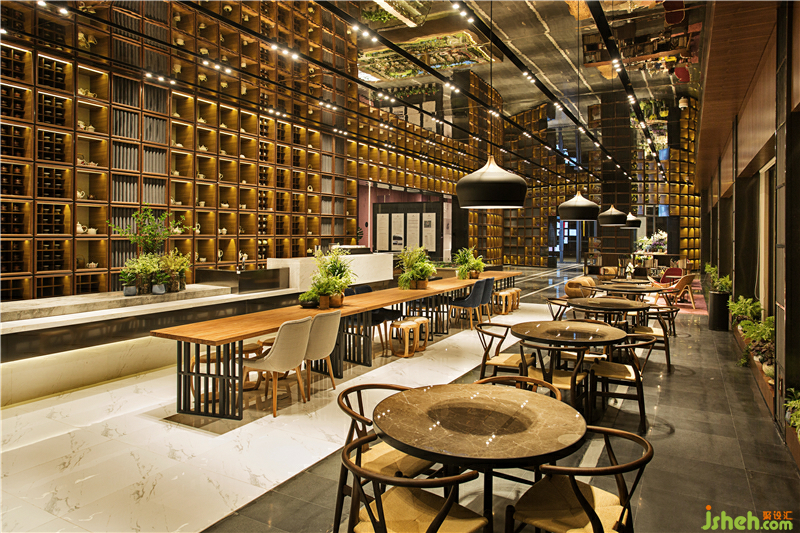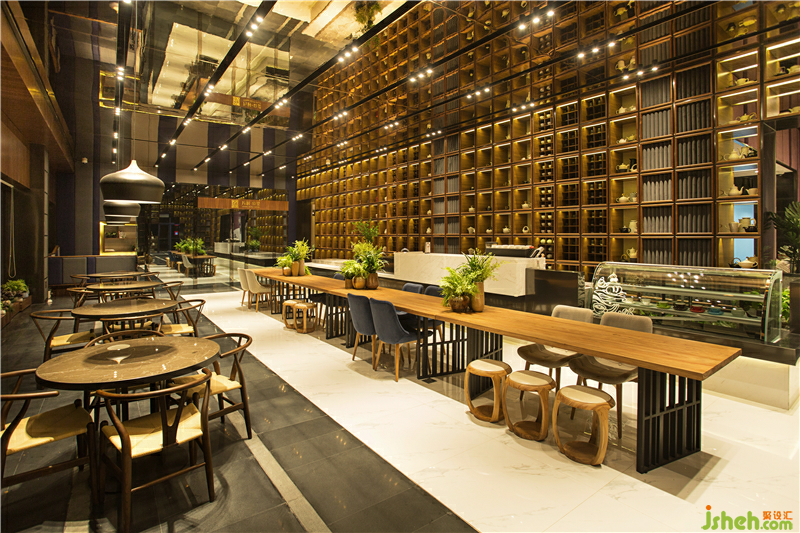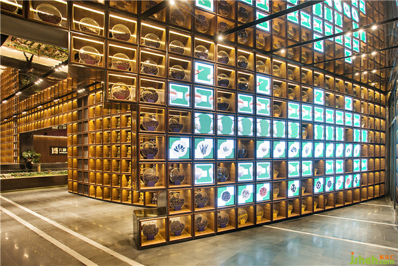 入口處的展示櫥窗呈現(xiàn)著流動(dòng)的畫面及親切的花店設(shè)計(jì),讓進(jìn)來后的儀式感顯得更加輕松??臻g的最大亮點(diǎn)是一條連貫的“茶文化陳列墻”,整齊的格子內(nèi)擺設(shè)了茶文化相關(guān)的陳列品,從花卉,到茶葉,到茶罐,到茶具。極具陣列感的陳列墻將茶文化元素與空間完美結(jié)合。頂面材質(zhì)為簡(jiǎn)約的鏡面不銹鋼材質(zhì),更加延伸了陳列墻的視覺張力。