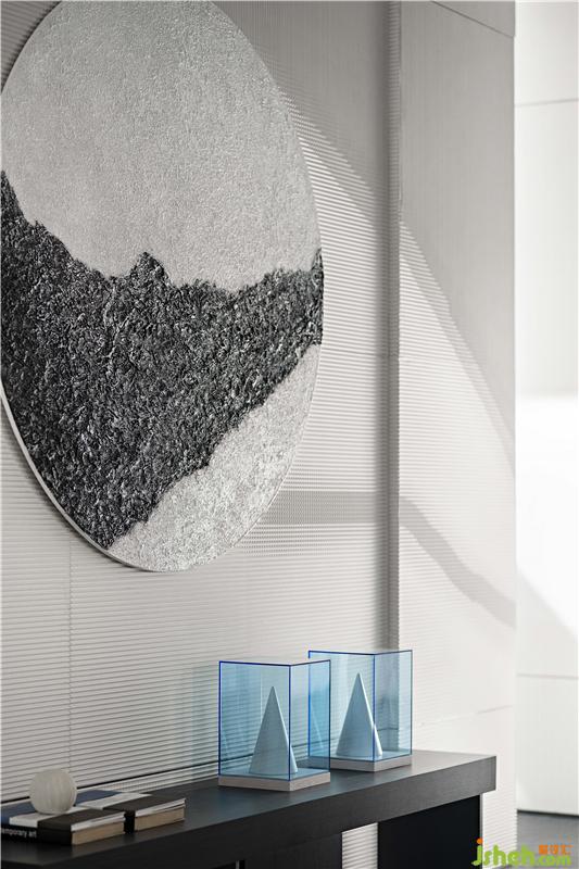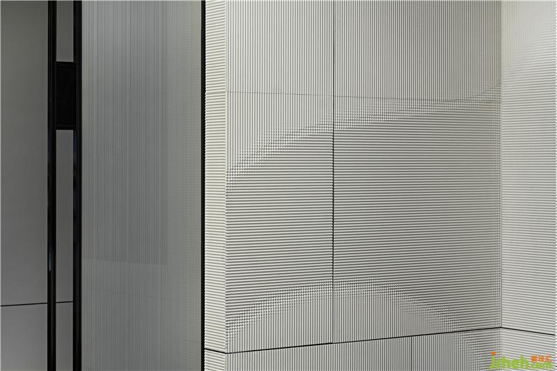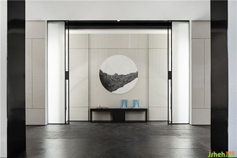 墨者,無(wú)色,亦五色也。入口處橫疊著的石臺(tái),以濃墨潤(rùn)之,漾開(kāi),有褶皺,有起伏,有顯有藏。走近一些,可見(jiàn)墨紋、漣漪,絲絲縷動(dòng),似乎要更淺些,如淡墨般,此番便為知黑。大面積的墻體守白作為墨之五色中的“清”來(lái)對(duì)待,只余一些隱約漾著的墨影。胡桃木和暖光燈的穿插平衡了空間中濃與清之間的體驗(yàn)感。