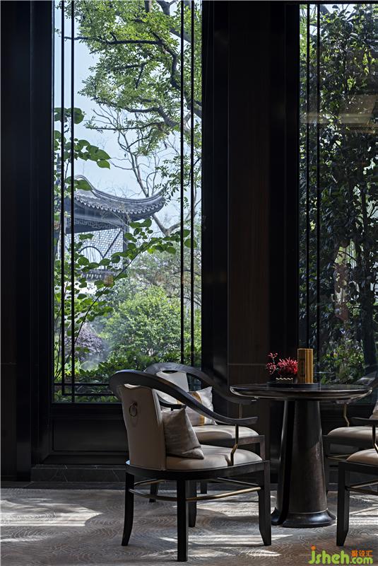 在空間的處理上,盡處造景的手法被運用到了極致,框景氤氳,呈現(xiàn)出恰如其分的藝術魅力。窗外自然景色流轉著,與室內氣韻繾綣相融。室內的有限空間由此得以無限延伸開來,與自然渾然一體。消弭了的空間界限,使其不受實體建筑結構的約束,室內外生命的自由融合,正是儒門中天人合一的哲思之智的體現(xiàn)。