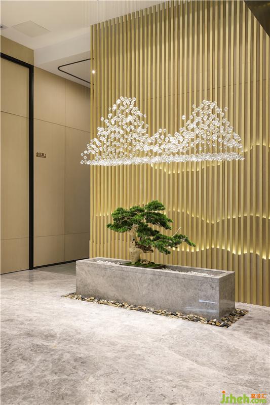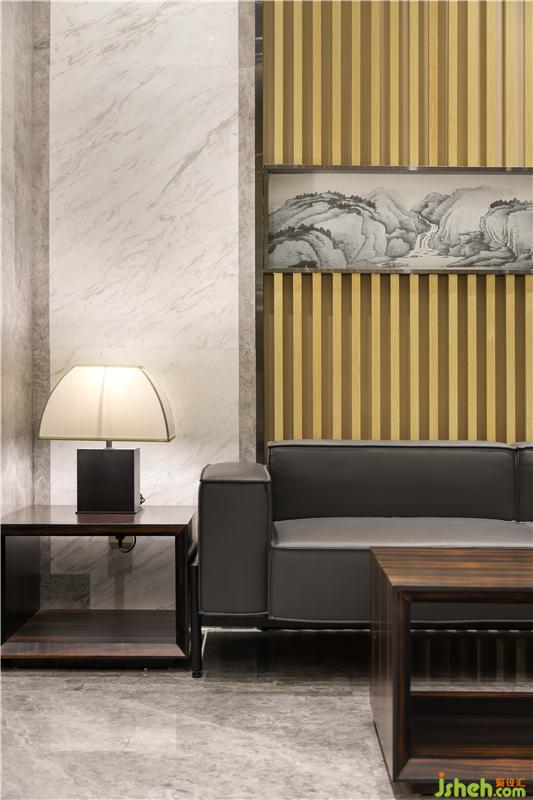 前臺作為辦公室的形象,需要引人注意,燈光就能非常好的達到聚焦的作用,在logo墻的上方用射燈對logo墻進行照射,起到重點提示的作用,讓前臺的設計更顯大氣。從正面的角度可以看出,前臺是用大氣的山水紋大理石制作,色調淡雅、紋理清晰、圖案美觀,大氣而優(yōu)雅。