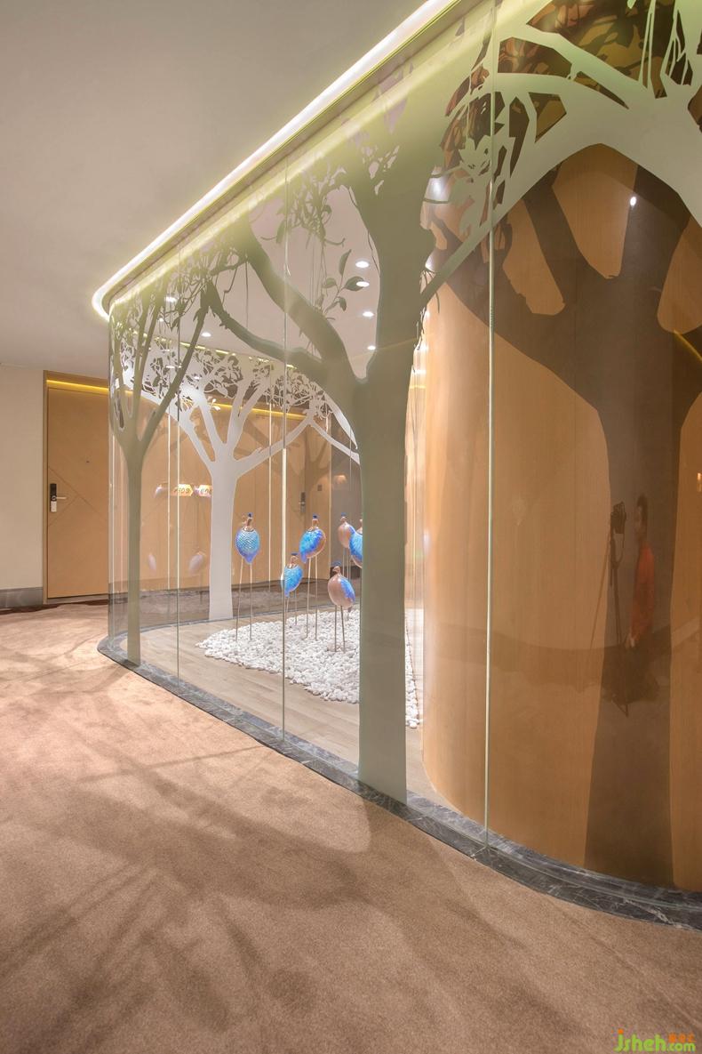 整體設(shè)計追求簡潔而時尚,明快的背景色彩與柔和燈光效果的協(xié)調(diào)則讓客人倍感舒心。長長的客房通道,在地毯的陪襯下在靜謐中流淌著華麗與舒適。在客房通道一旁還有一群候鳥,就好似在深圳紅樹林里每年都會有一群候鳥從西伯利亞飛回來過冬的場景。在整個客房通道空間光線和景色的融合,帶給人親近自然的感受,使視覺上具有通透感。