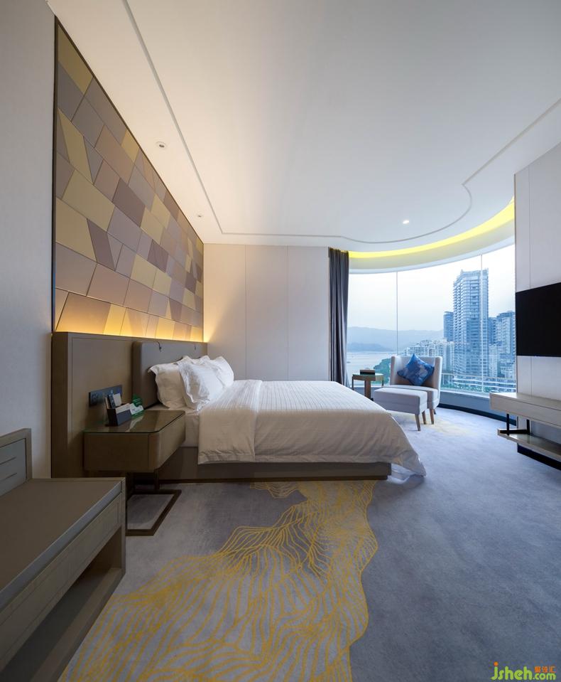 客房地毯顏色與大海融合一體,添加不同的藝術(shù)紋路且又具有代表性,根據(jù)每個不同代表性房間的設(shè)計,使整個空間布局規(guī)整。床的背景墻使用色塊表現(xiàn)年輕態(tài)的思維邏輯有創(chuàng)想,且清晰明朗,呈現(xiàn)一種潛力無限的狀態(tài)