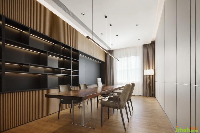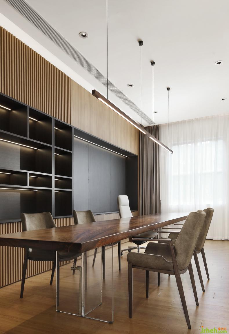 會(huì)客廳在原木色包裹之下同樣令人心情放松,商務(wù)感并沒有那么厚重。與之前的會(huì)客空間相比,設(shè)計(jì)師特別處理了私密與隔音的問題,且將會(huì)客的空間集中規(guī)制,統(tǒng)一規(guī)劃,吊燈與桌椅簡而不俗,盡顯細(xì)節(jié)之處的嚴(yán)謹(jǐn)設(shè)計(jì)思考