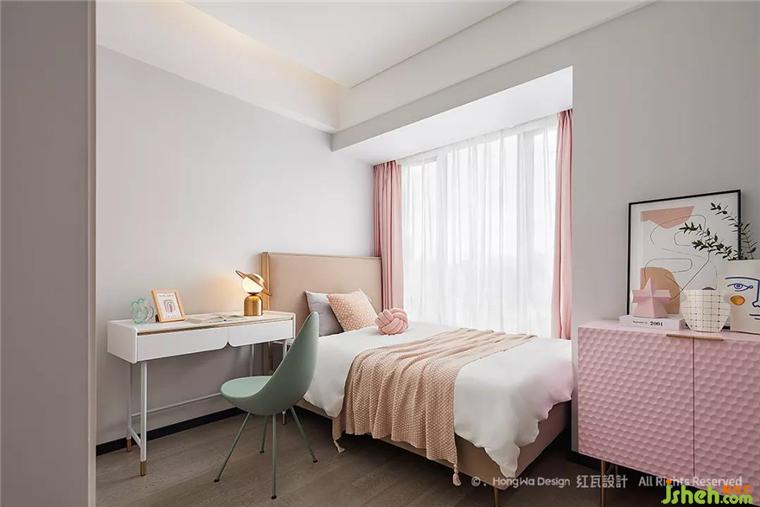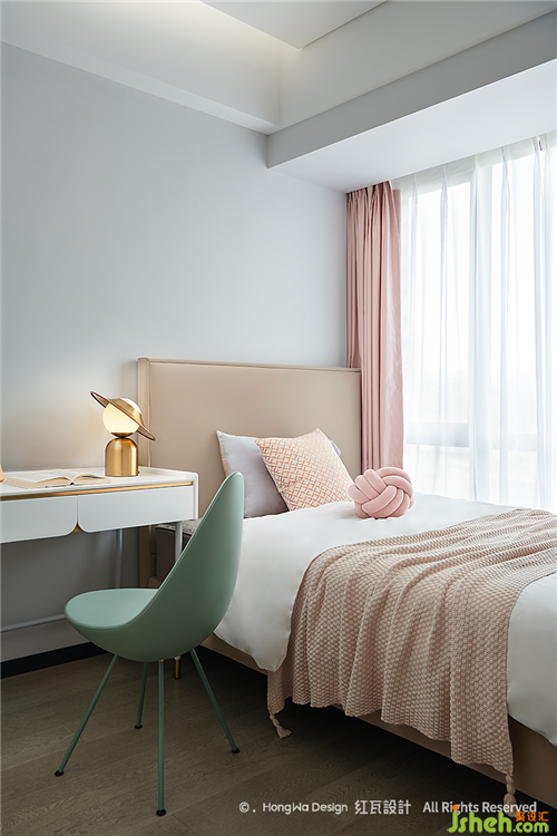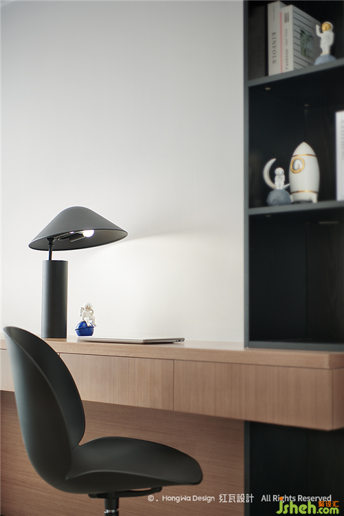 男孩房的布置更多是跟隨興趣,這是一個(gè)五六歲男孩的臥室,天生愛(ài)探索,向往科技,所以我們用了火箭、太空人等擺件,藍(lán)色的窗簾,抱枕以及整個(gè)空間,都顯得比較冷靜,可以在其中自在的思考