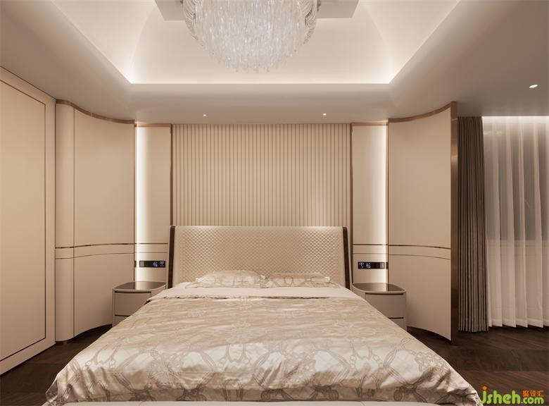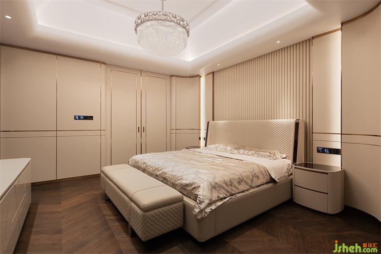 Master bedroom integrity, elegant and delicate, velvet bed products of western elegance, showing a living attitude and delicate taste of life expression. Different materials, unified tone, ultimately lead to the heart of love for a better life. The moment I looked out of the window, the luxury and elegance of the interior and the quiet beauty of nature reached a comfortable balance.