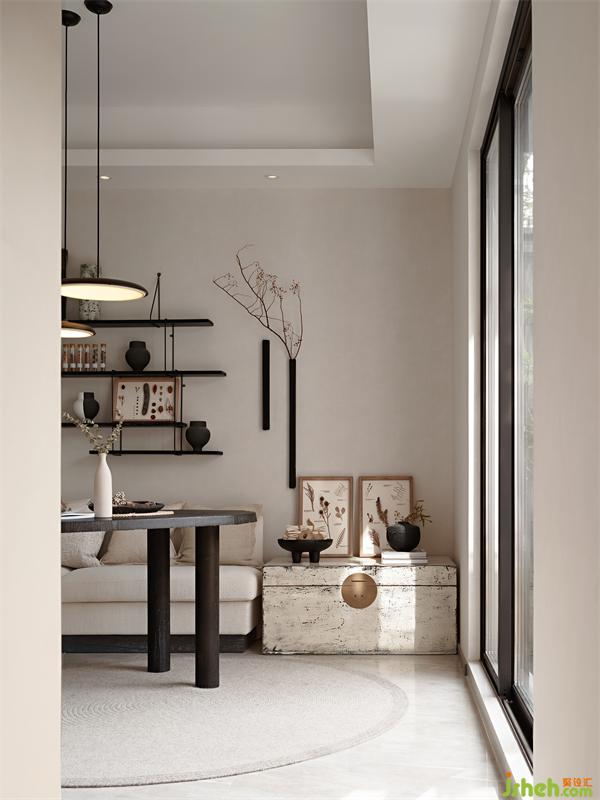 人居以融入自然為上,山間聽取潺潺的流水。大大的院子,盈盈的笑聲,人、自然、空間···和諧與共。深木色百寶格,收納各色器玩,古意盎然,隨便從山間扦插一根綠植,就得到一片風(fēng)景,純?nèi)诲羞b一派天然。