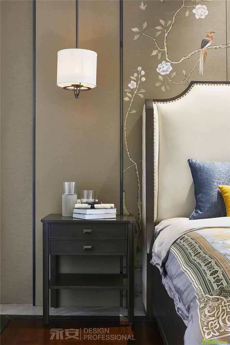 臥室的吊頂和燈具都和家里主空間采用同樣的設(shè)計手法,讓每個空間各自分明又和諧一致。電視柜用藍色去裝點,提亮了整個空間的明度,中式和現(xiàn)代的糅合呈現(xiàn)了新中式的獨特魅力。