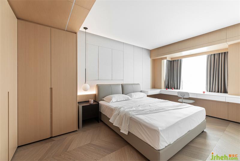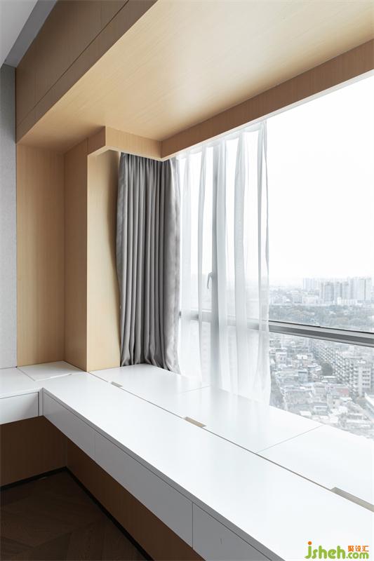 靠窗部分結(jié)合飄窗造型做成梳妝加書臺一體的桌子