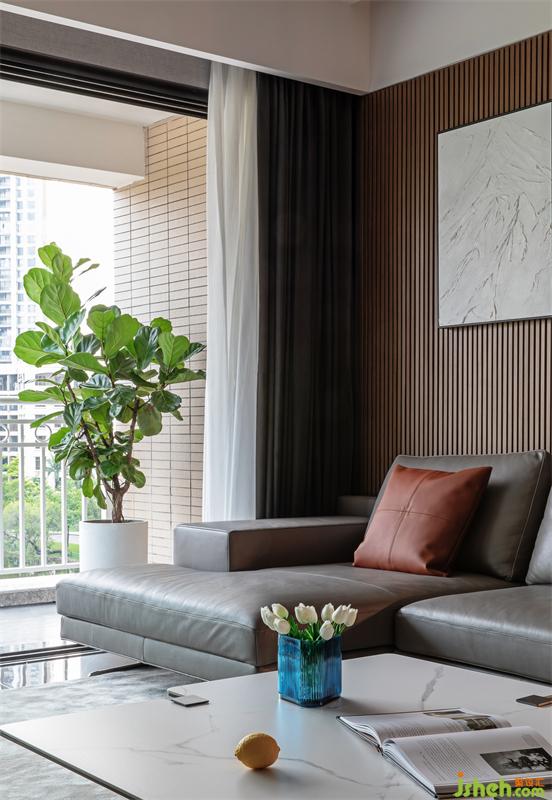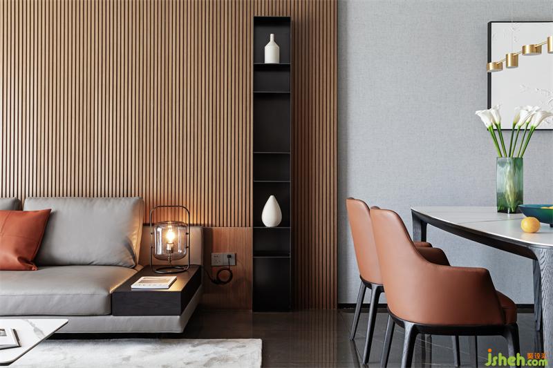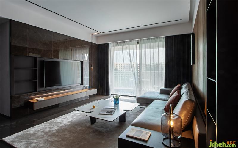 惠州家居設計將電視背景墻延伸至整個立面,使空間整體統(tǒng)一,同時結合功能性,運用切割和嵌入的手法做不對稱的造型處理,打破傳統(tǒng)對稱呆板的背景墻做法。