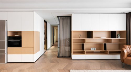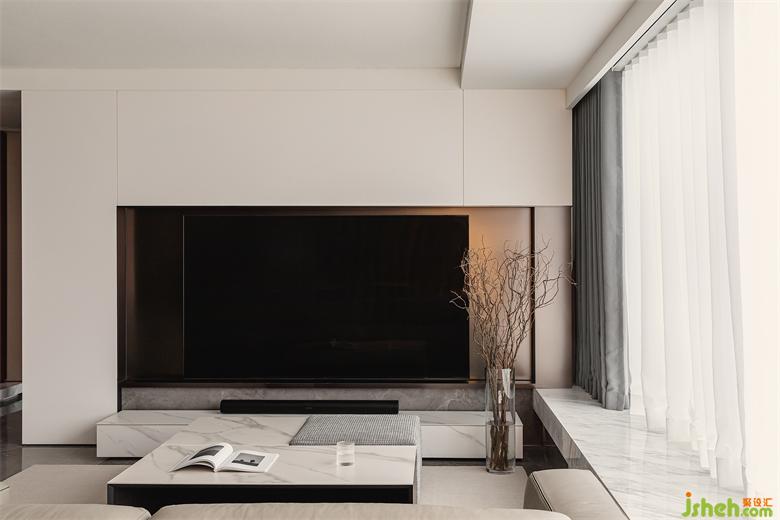 The TV background wall extends to the bay window. Since the upper and lower structure of the bay window cannot be changed, we skillfully combine the disadvantages of the shape and structure, so as to conceal the abruptness brought by the structure, and secondly, it can make the TV background wall more spacious and atmospheric.