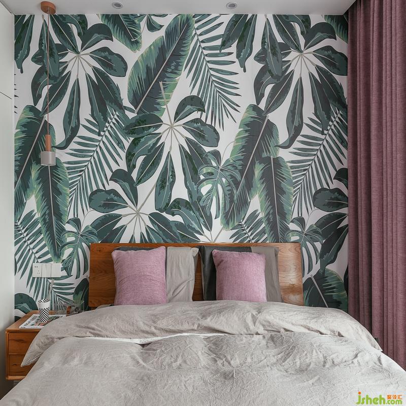 綠色如奇幻森林般的主臥背景墻給人以舒適的視覺感受,床品也以舒適為主,體現(xiàn)輕奢美式的細(xì)節(jié)。