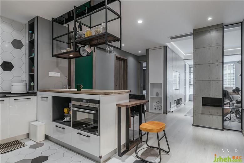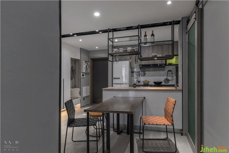 室內(nèi)設計師設計開放式的布局讓餐廳通透明亮,餐廳廚房之間的聯(lián)系也更加緊密,島臺上的置物架便于兩個空間收納。折疊的餐桌既可以作為吧臺也可以作為餐桌使用,釋放空間。
