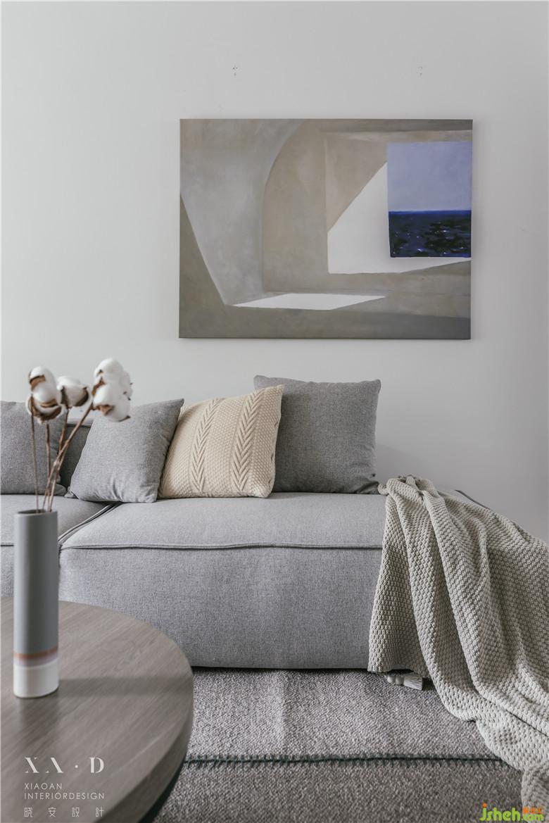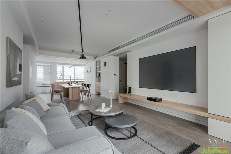 陽臺與客廳相連,頂部用木色做臺階,弱化陽臺門梁。室內(nèi)設(shè)計師使用白色的定制柜體包裹著吊頂,增強了整體性的同時用一條木色貫穿,看似破壞,實則呼應(yīng)。