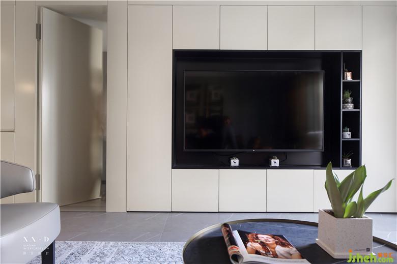 考慮到客廳空間的整體,室內(nèi)設(shè)計(jì)師將原來進(jìn)次臥室的門洞往左邊方向移動(dòng)設(shè)計(jì)成隱形門,不影響使用的同時(shí),美觀上與電視墻統(tǒng)一。