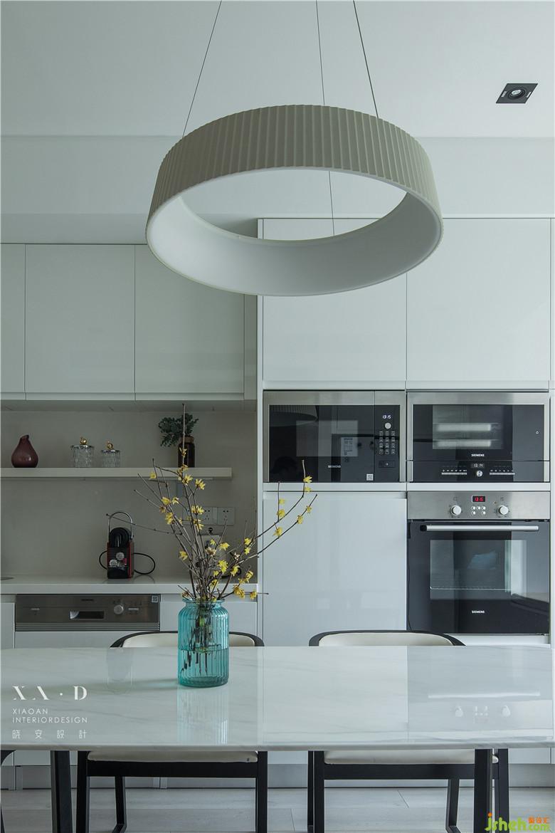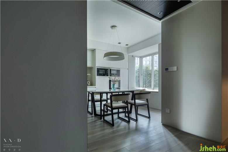 在原有空間的基礎(chǔ)上,廚房的部分做了比較大的改變。室內(nèi)設(shè)計(jì)師將原有的臥室和餐廳位置做了對(duì)掉,相對(duì)空間較大的臥室被設(shè)計(jì)成了餐廳和西廚的所在,蒸烤一類的西式料理盡可在這里完成。剛好這個(gè)空間也有一個(gè)飄窗的設(shè)計(jì),于是女主人午后的時(shí)光可以在這里悠閑度過(guò)。中式廚房躲在廊道的右手邊,大片的玻璃移門有效的滿足了廚房對(duì)于光的需求。