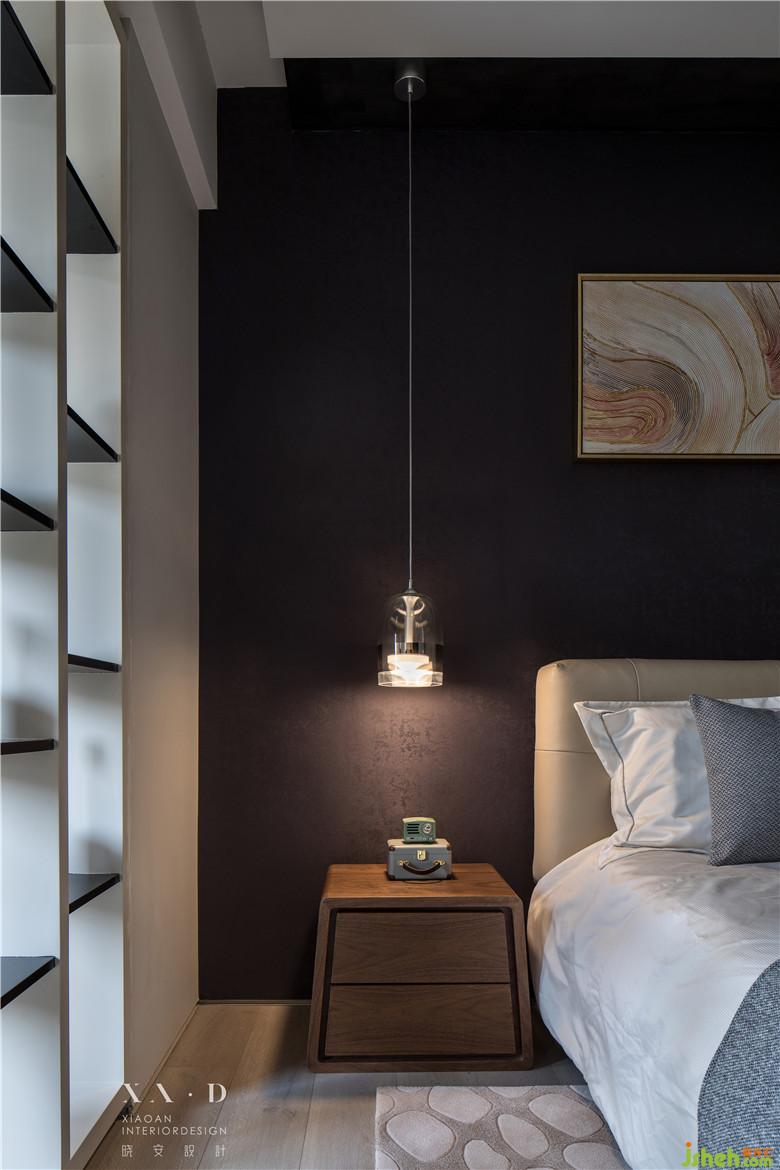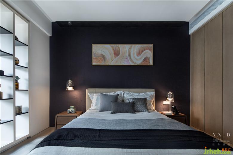 底墻室內(nèi)設(shè)計(jì)師采用了深色的壁紙,有效拉伸了空間的視覺(jué)效應(yīng)。簡(jiǎn)單的天花板和衣柜形式,突出了整體空間的簡(jiǎn)約設(shè)計(jì)風(fēng)格。