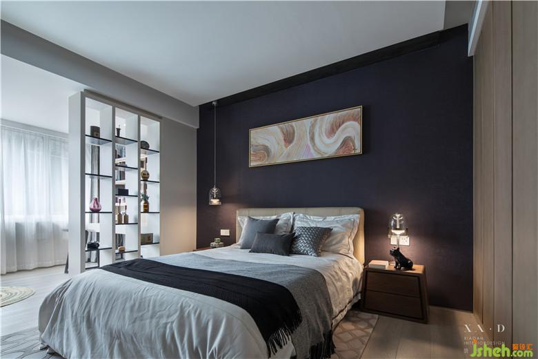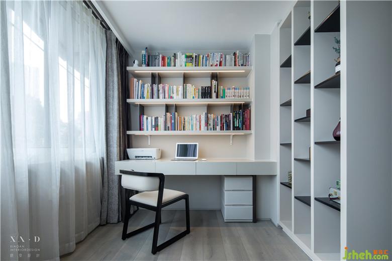 在臥室一側(cè)的書(shū)房與臥室區(qū)域隔而不斷,互不干擾。前側(cè)和右側(cè)的層架,有效的緩解了千層藏書(shū)的存放壓力。
