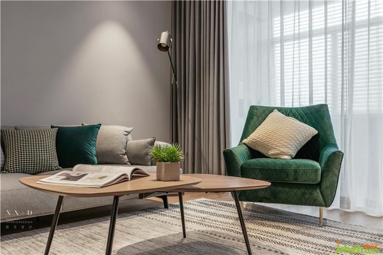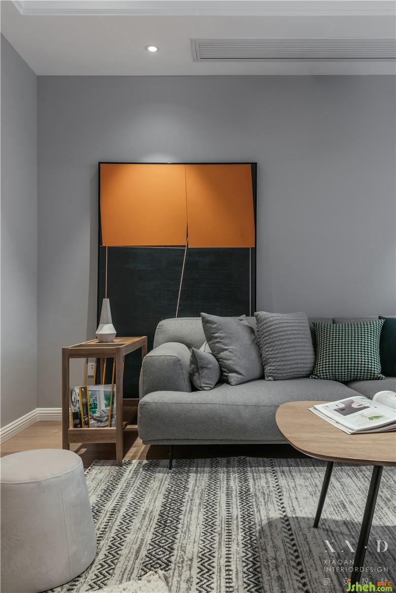 客廳硬裝上沒有多余的造型,墻面灰色乳膠漆的選擇,給后期軟裝搭配留有充分的發(fā)揮空間。灰色基調(diào)的空間里加上墨綠色的單人椅和橙色抽象的裝飾畫,簡約舒適的空間中多了一絲活潑。