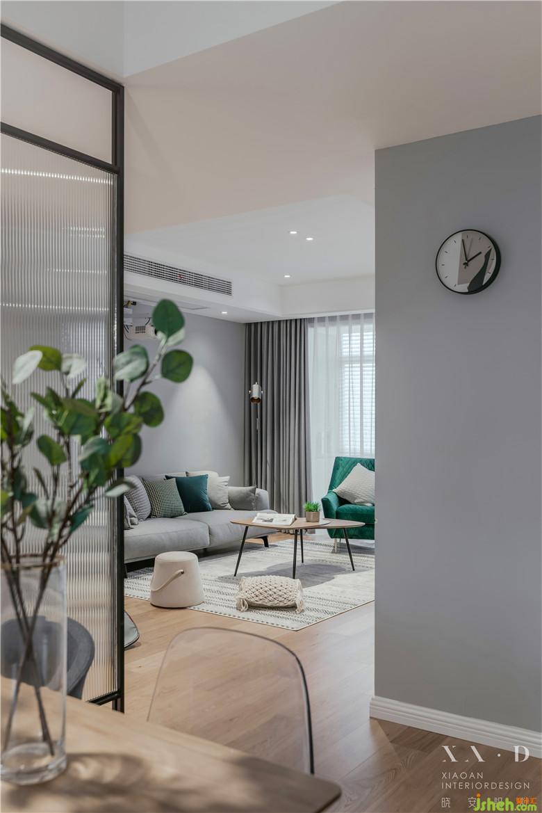 進門玄關(guān)處,室內(nèi)設(shè)計師以長虹玻璃將玄關(guān)與餐廳的空間區(qū)隔開。透明玻璃的使用不僅不影響空間的視野,反而延伸了空間感。